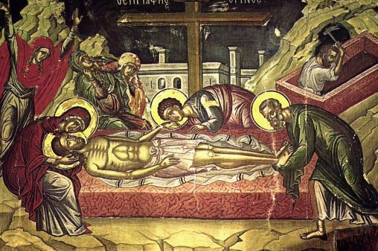 Το δεσποτικό αυτό θάνατο και η άψυχη κτίση, πενθώντας, τον τρέμει και αλλοιώνεται από το φόβο αλλά ο Δημιουργός της κτίσεως ακόμα και όταν είναι νεκρός, λογχίζεται την ακήρατη πλευρά Του και ρέει απ’ αυτή αίμα και νερό. Τέλος, κατά τη δύση του ηλίου, έρχεται ο Ιωσήφ από Αριμαθείας και ο Νικόδημος μαζί με αυτόν, και οι δυο κρυφοί μαθητές του Ιησού, αποκαθηλώνουν από το Σταυρό το πανάγιο του διδασκάλου σώμα, το αρωματίζουν, το τυλίγουν με καθαρό σεντόνι και αφού το έθαψαν σε καινούργιο τάφο, κυλούν στο στόμιο του μεγάλο λίθο.