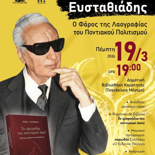 Μια ξεχωριστή εκδήλωση μνήμης και τιμής για τον σπουδαίο λαογράφο του ποντιακού ελληνισμού, Στάθη Ευσταθιάδη, διοργανώνουν ο Μορφωτικός Σύλλογος Ποντίων Κομοτηνής και Περιφέρειας «Ο Εύξεινος Πόντος» και η Δημοτική Βιβλιοθήκη Κομοτηνής, στο πλαίσιο των δράσεων που υλοποιούνται σε συνεργασία με την ΚΟΙΝ.Σ.ΕΠ. «Κομοτηνή Εν Δράσει».