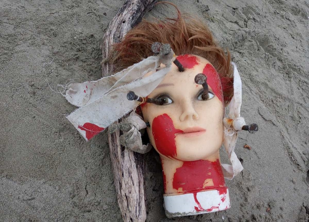 Ένα μακάβριο εύρημα προκάλεσε αναστάτωση στην παραλία του Δρεπάνου στην Ηγουμενίτσα. Μια κούκλα, πεταμένη στην άμμο, βρέθηκε με καρφιά καρφωμένα στο κεφάλι, δεμένα υφάσματα και έντονο κόκκινο χρώμα στο πρόσωπο και τον λαιμό, προκαλώντας έντονο προβληματισμό σε όσους την αντίκρισαν.
