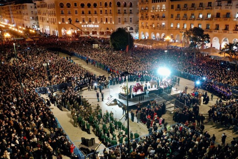 Σε ένα απέραντο σκηνικό κατάνυξης μετατράπηκε το ιστορικό κέντρο της Θεσσαλονίκη, με πλήθος κόσμου και χιλιάδες πιστούς να ακολουθούν τις περιφορές των Επιταφίων που κατέληξαν στην πλατεία Αριστοτέλους, όπου για τρίτη συνεχή χρονιά αντάμωσαν πέντε Επιτάφιοι από ναούς της πόλης, κορυφώνοντας τη συγκίνηση και τη συμμετοχή.