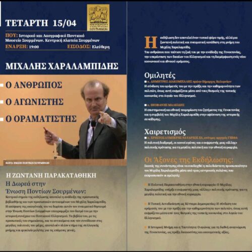 Σήμερα, Τετάρτη 15 Απριλίου, στην 1η ημέρα των πενθήμερων εκδηλώσεων τις Ένωσης Ποντίων Σουρμένων, πραγματοποιείται στις 19:00, στο Ιστορικό και Λαογραφικό Ποντιακό Μουσείο Σουρμένων, στην κεντρική πλατεία, η εκδήλωση αφιερωμένη στον Μιχάλη Χαραλαμπίδη, με ελεύθερη είσοδο για το κοινό.