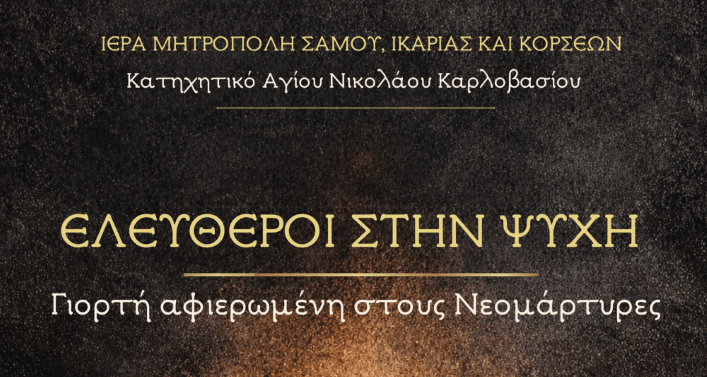 Ι.Μ.ΣΑΜΟΥ: Η Ιερά Μητρόπολη Σάμου, Ικαρίας και Κορσεών και το Κατηχητικό Αγίου Νικολάου Καρλοβασίου διοργανώνουν εκδήλωση με τίτλο «ΕΛΕΥΘΕΡΟΙ ΣΤΗΝ ΨΥΧΗ», αφιερωμένη στους Νεομάρτυρες της πίστεώς μας.