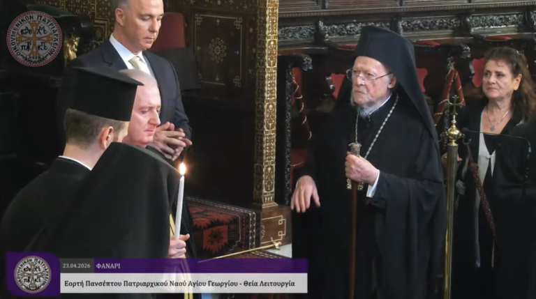 Φανάρι: Με ιδιαίτερη λαμπρότητα τελέστηκε σήμερα, Πέμπτη 23 Απριλίου 2026, η Τρισαρχιερατική Θεία Λειτουργία επί τη εορτή του Αγίου Μεγαλομάρτυρος Γεωργίου του Τροπαιοφόρου, στον πανηγυρίζοντα Πάνσεπτο Πατριαρχικό Ναό στο Φανάρι, παρουσία κληρικών, μοναχών και πλήθους πιστών από την Κωνσταντινούπολη αλλά και από την Ελλάδα.