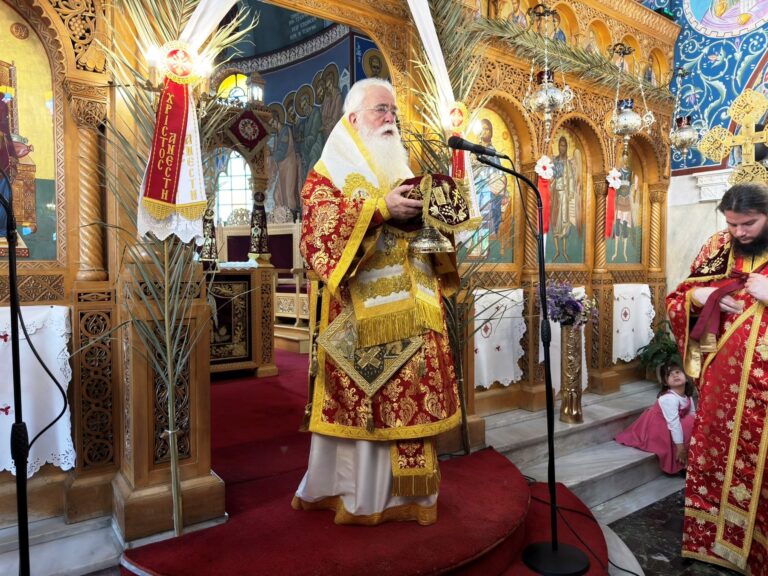 Στην ομιλία του ο Σεβασμιώτατος ανέφερε ότι: «Όλοι οι Άγιοι, άνδρες και γυναίκες, είναι μάρτυρες της Αναστάσεως του Χριστού και μάρτυρες της Αναστάσεως είμαστε και όλοι οι πιστοί, όσοι βαπτιστήκαμε στο όνομα της Αγίας Τριάδος και πιστεύουμε στον Αναστάντα Κύριό μας. Όμως ο Άγιος Γεώργιος, τον οποίο σήμερα τιμούμε, είναι κατεξοχήν Αναστάσιμος Άγιος, διότι η εορτή του είναι πάντοτε συνδεδεμένη με το “Χριστός Ανέστη” και το φως της Αναστάσεως. Ο Άγιος αυτός δεν πίστεψε απλώς σε έναν διδάσκαλο, αλλά στον Χριστό που σταυρώθηκε, πέθανε και αναστήθηκε και γι’ αυτό έγινε γενναίος μάρτυρας της πίστεως, νικώντας κάθε φόβο και κάθε κακό. Μας διδάσκει ακόμη ότι η ψυχή του ανθρώπου είναι σαν γη που χρειάζεται καλλιέργεια· όπως ο γεωργός φροντίζει τη γη του, έτσι και εμείς καλούμαστε να φροντίζουμε την ψυχή μας. Με τον Σταυρό του Χριστού αγωνιζόμαστε να διώξουμε ό,τι κακό υπάρχει μέσα μας και να καλλιεργήσουμε την πίστη, την αγάπη και την αλήθεια, ώστε η ζωή μας να γεμίζει με το φως της Αναστάσεως».
