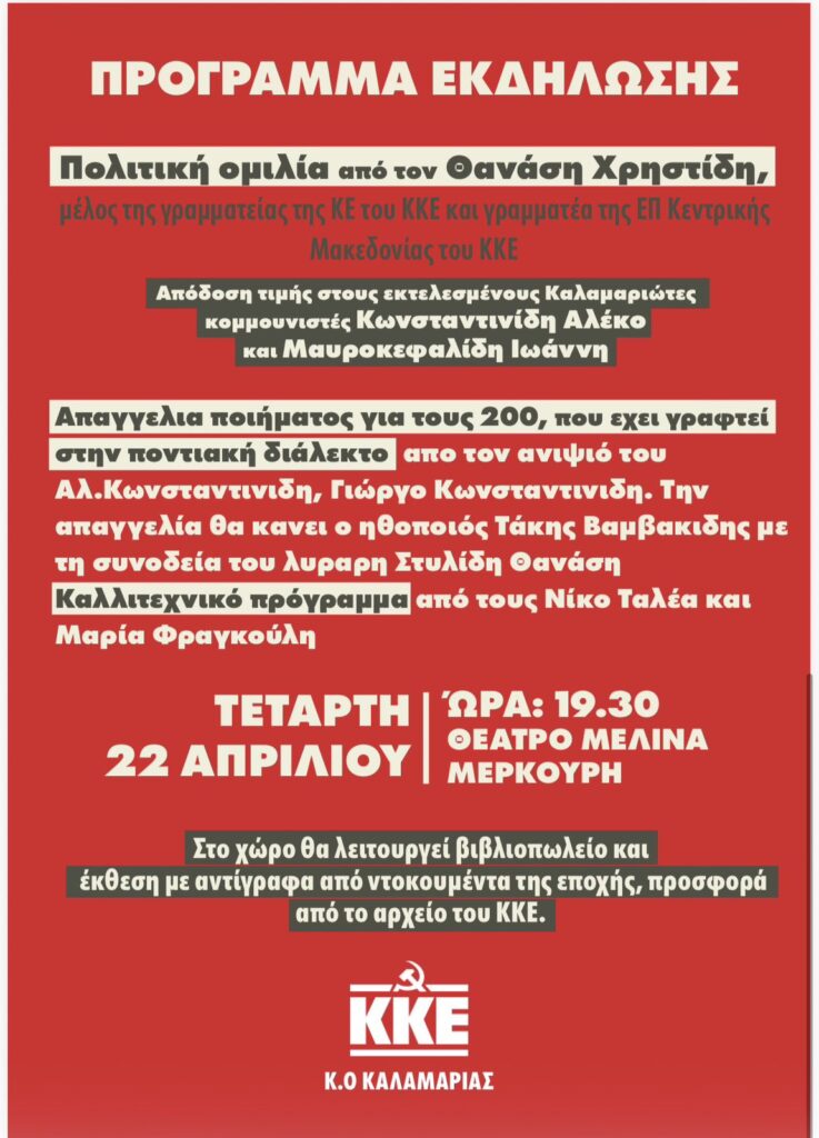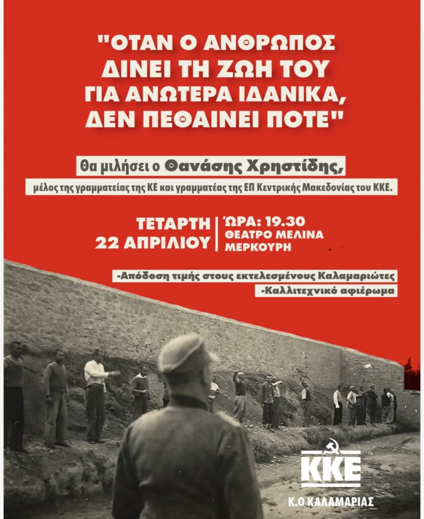 Με κεντρικό μήνυμα ότι «όταν ο άνθρωπος δίνει τη ζωή του για ανώτερα ιδανικά, δεν πεθαίνει ποτέ», η Κ.Ο. Καλαμαριάς του ΚΚΕ διοργανώνει εκδήλωση μνήμης την Τετάρτη 22 Απριλίου στις 19:30, στο Θέατρο «Μελίνα Μερκούρη», αποδίδοντας τιμή στους εκτελεσμένους Καλαμαριώτες και πλαισιώνοντας τη βραδιά με πολιτικό και καλλιτεχνικό περιεχόμενο.