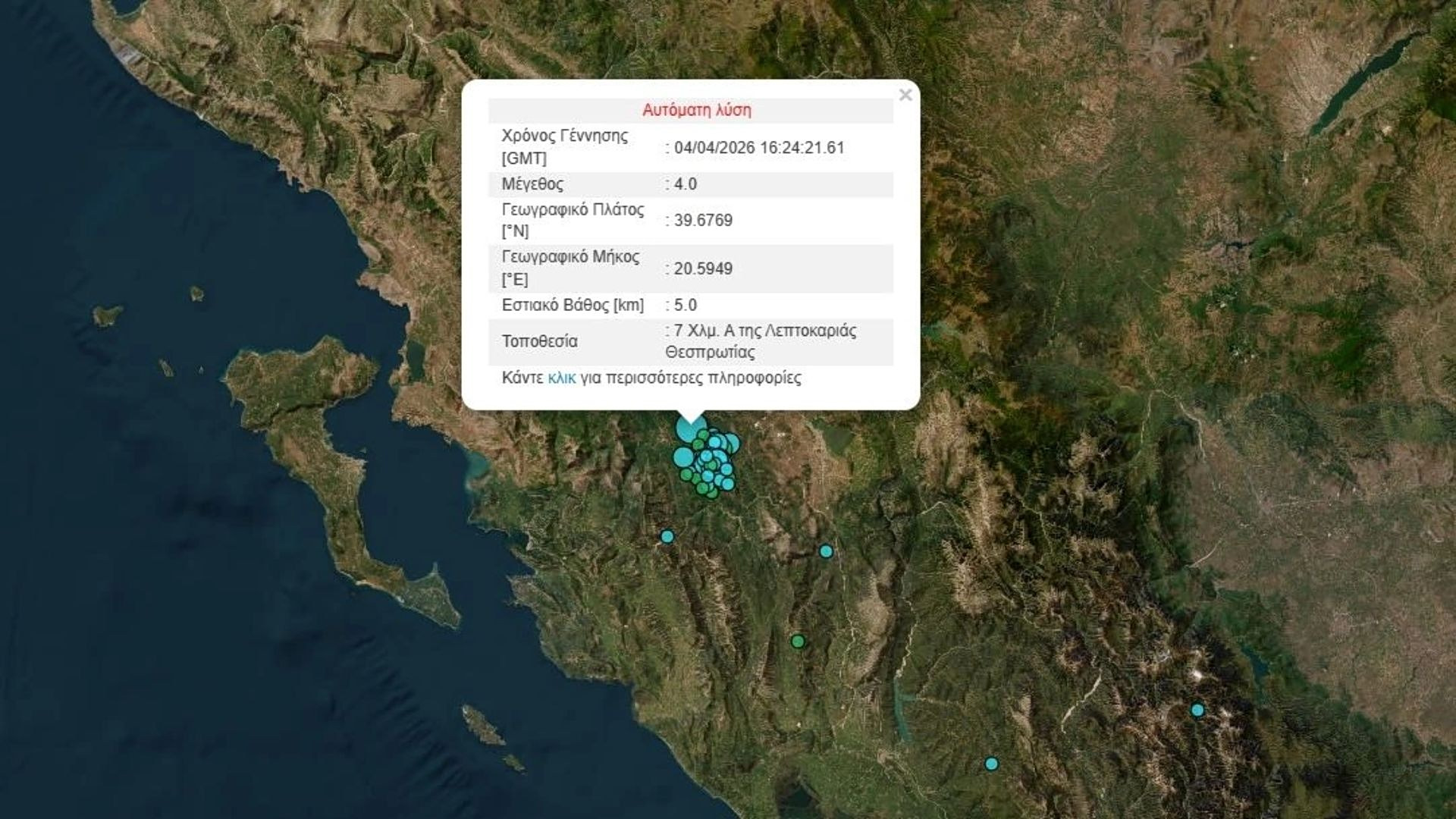 Σύμφωνα με την Αυτόματη Λύση του Γεωδυναμικού Ινστιτούτου Αθηνών το επίκεντρο της δόνησης σημειώθηκε 7 Χλμ. Α της Λεπτοκαριάς Θεσπρωτίας και το εστιακό βάθος στα χλ.μ.