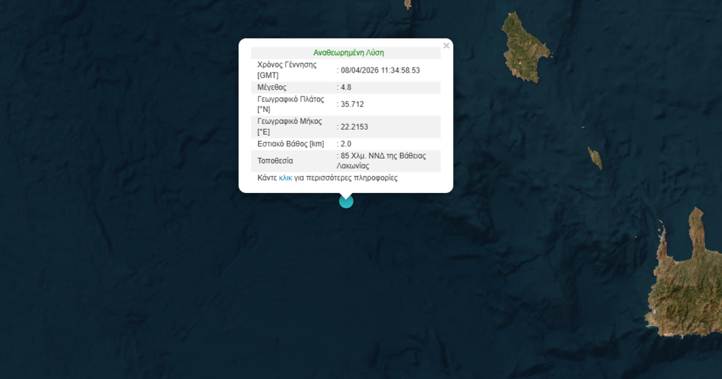 Ο σεισμός καταγράφηκε στις 11:34:58 (GMT), με επίκεντρο περιοχή στη θαλάσσια ζώνη, περίπου 85 χιλιόμετρα νοτιοδυτικά της Βάθειας Λακωνίας.