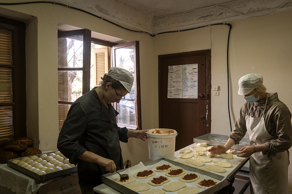 Δύο εθελοντές φτιάχνουν πίτες για τη συλλογική κουζίνα. Ο φούρνος Μελκιν Ελβάν λειτουργεί από το 2014 και αποτελεί μία από τις πρώτες δομές που οργάνωσε η κοινότητα. (Νίκος Πηλός)